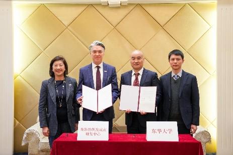 图 1正在中国纺织及裁缝研发核心杨敏贤密斯 (左一)及东华大学校长项延训传授(左一)下,加强科研合做