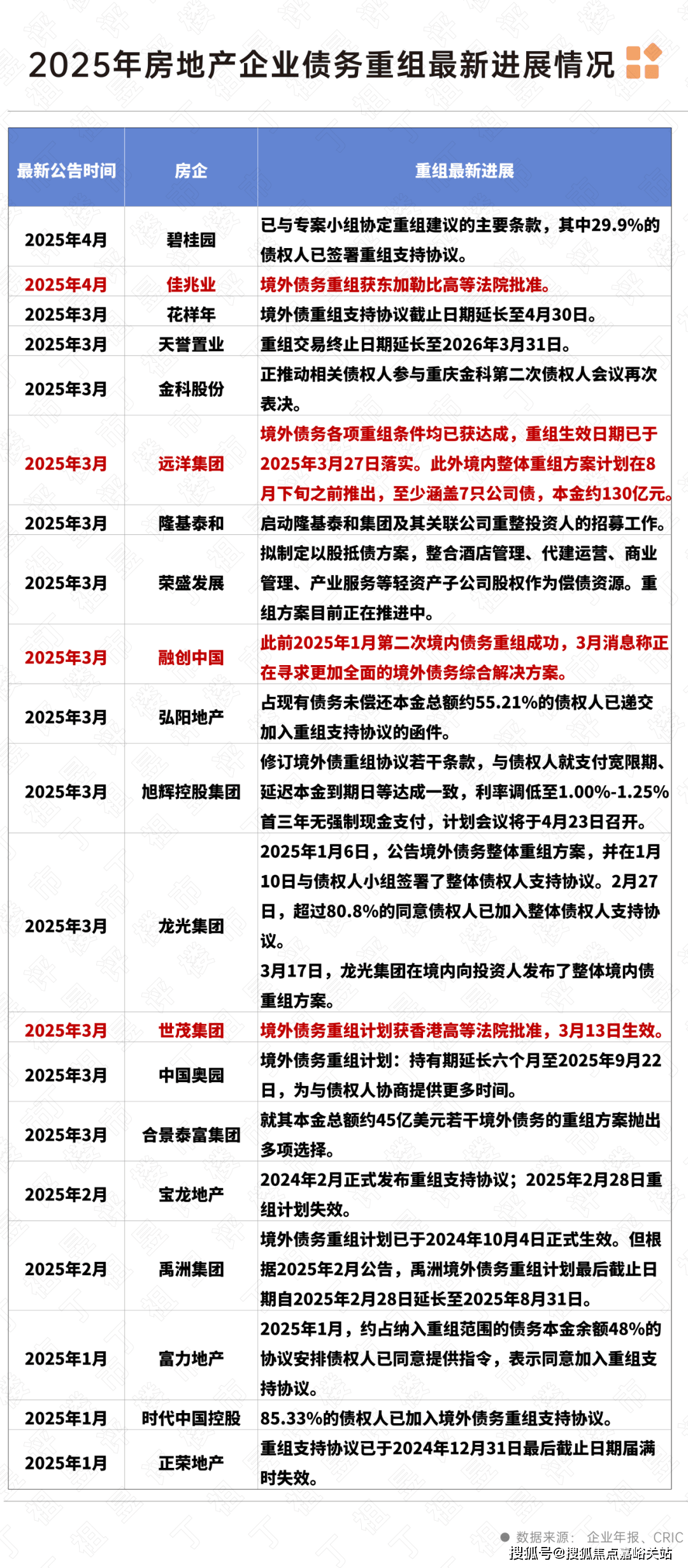 除了协信之外,还有多家房企的债权沉组打算获批,房企债权沉组正在2025年按下了加快键。1月融创十笔境内债权沉组方案获核准,成为首家完成境内债二次沉组的房企,同时融创也已提出第二次境外债权沉组方案。3月以来,世茂集团、近海集团、吉兆业等房企先后通知布告,其境外债权沉组打算获得相关法院核准。