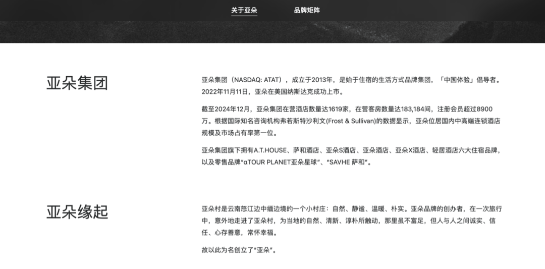 公开材料显示,亚朵酒店为亚朵集团(纳斯达克股票代码:ATAT)旗下住宿品牌。而公司官网引见,截至2024年12月,亚朵集团正在营酒店数量达1619家,正在营客房数量达183,184间,注册会员跨越8900万。